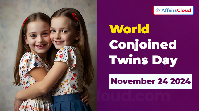 पहला संयुक्त राष्ट्र (UN) का विश्व संयुक्त जुड़वां दिवस (WCTD) 24 नवंबर को दुनिया भर में मनाया गया, ताकि संयुक्त जुड़वां बच्चों के बारे में जागरूकता बढ़ाई जा सके, उनकी भलाई का समर्थन किया जा सके और उनके सामाजिक समावेश को बढ़ावा दिया जा सके।