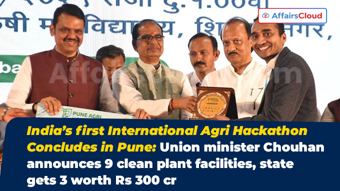 केंद्रीय मंत्री शिवराज सिंह चौहान, कृषि और किसान कल्याण मंत्रालय (MoA&FW) ने पुणे, महाराष्ट्र में 01 जून से 03 जून, 2025 तक आयोजित भारत के पहले अंतर्राष्ट्रीय कृषि हैकथॉन के समापन सत्र के दौरान पूरे भारत में 9 बागवानी सुविधाओं की स्थापना के लिए ‘स्वच्छ संयंत्र कार्यक्रम’ शुरू करने की घोषणा की।