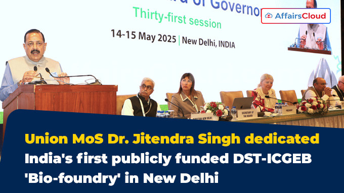 मई 2025 में, केंद्रीय राज्य मंत्री (Mos) (स्वतंत्र प्रभार, IC), DR. जितेंद्र सिंह, विज्ञान और प्रौद्योगिकी मंत्रालय (MoS&T) ने इंटरनेशनल सेंटर फॉर जेनेटिक इंजीनियरिंग एंड बायोटेक्नोलॉजी (ICGEB) के गवर्नर्स की 31वीं बोर्ड बैठक के दौरान भारत के अपनी तरह के पहले सार्वजनिक वित्त पोषित विज्ञान और प्रौद्योगिकी विभाग (DST)-ICGEB ‘बायो-फाउंड्री’ को समर्पित किया। नई दिल्ली, दिल्ली में आयोजित। उन्होंने भारत को उभरता हुआ वैश्विक बायोटेक गंतव्य बताया।