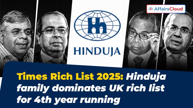 मई 2025 में, 110 साल पुराने बहुराष्ट्रीय हिंदुजा समूह के अध्यक्ष गोपीचंद हिंदुजा के नेतृत्व में हिंदुजा परिवार ने एक बार फिर “द संडे टाइम्स रिच लिस्ट 2025“ में ब्रिटिश पाउंड स्टर्लिंग (GBP) 35.3 बिलियन (लगभग 2,530,000 करोड़ रुपये) की कथित कुल संपत्ति के साथ शीर्ष स्थान हासिल किया है।