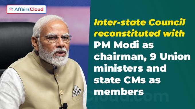 भारत सरकार (GoI) ने अंतर-राज्य परिषद (ISC) का पुनर्गठन किया है, जो केंद्र–राज्य और अंतर–राज्य समन्वय को बढ़ाने के लिए एक महत्वपूर्ण निकाय है, जिसके अध्यक्ष प्रधानमंत्री (PM) नरेंद्र मोदी हैं।