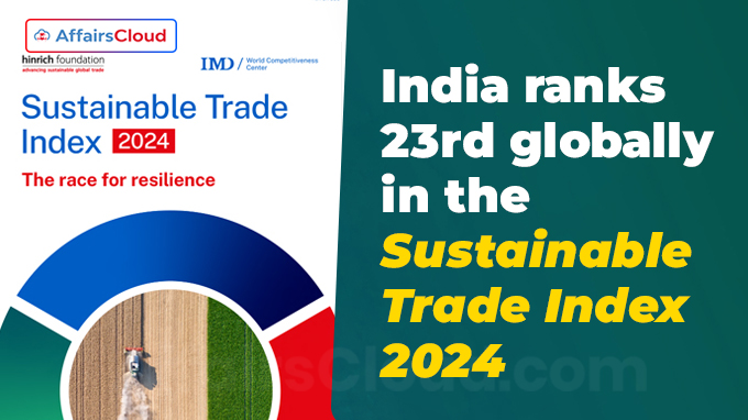 सस्टेनेबल ट्रेड इंडेक्स (STI) 2024 के अनुसार, भारत जो दुनिया की 5वीं सबसे बड़ी अर्थव्यवस्था है, 100 में से 24 के समग्र स्कोर के साथ वैश्विक स्तर पर 23वें स्थान पर है। भारत ने 2023 में 24वें स्थान से अपनी रैंकिंग में 1 स्थान का सुधार किया है।