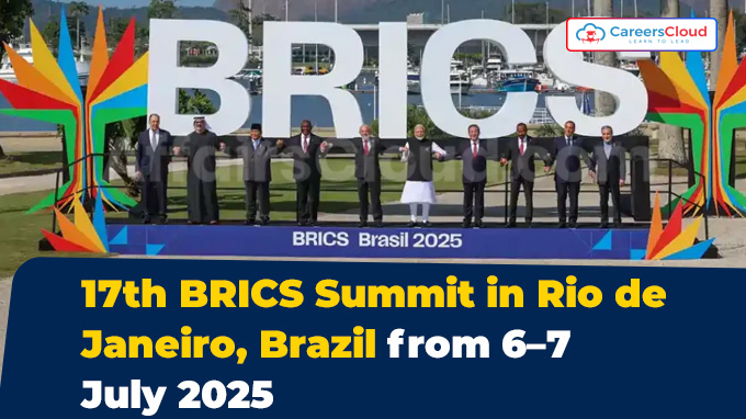 17वां BRICS (ब्राजील, रूस, भारत, चीन और दक्षिण अफ्रीका) शिखर सम्मेलन ब्राजील के रियो डी जनेरियो में 6 से 7 जुलाई 2025 तक ब्राजील की अध्यक्षता में आयोजित किया गया । शिखर सम्मेलन की मेजबानी ब्राजील के राष्ट्रपति लुइज इनासियो लूला डा सिल्वा ने की थी।