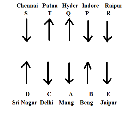 Ten persons from ten different cities viz. Delhi, Jaipur, Patna, Indore, Mangaluru, Chennai, Hyderabad, Bengaluru, Raipur and Sri Nagar are sitting in two parallel rows containing five people each, in such a way that there is an equal distance between adjacent persons. In row 1- A, B, C, D and E are seated and some of them are facing South and some of them are facing North. In row 2 – P, Q, R, S and T are seated and some of them are facing South and some of them are facing North. Therefore in the given seating arrangement, each member seated in a row either faces another member of the other row or seated behind each other.(All the information given above does not necessarily represent the order of seating in the final arrangement.)
