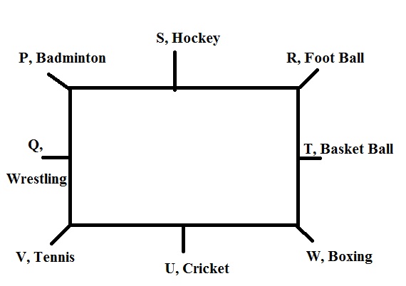 W is the only sister-in-law of P whereas Q likes WRESTLING and daughter-in-law of RP who is the father of U and uncle of V, sits to the left of the person who likes HOCKEY. U is an immediate neighbor of her aunty W who does not sit next to S. R does not like Tennis or Badminton. The two youngest members sit next to each other. The one likes the Cricket sits between V and the one who likes BOXING. V is third to the left of S. The one who likes WRESTLING sits between the persons who like Badminton and Tennis Respectively. S’s husband and son sit next to her. Foot Ball is not liked by V’s father. V does not like Basket Ball or Badminton. S is the mother of P and T, and sits second to the left of T.