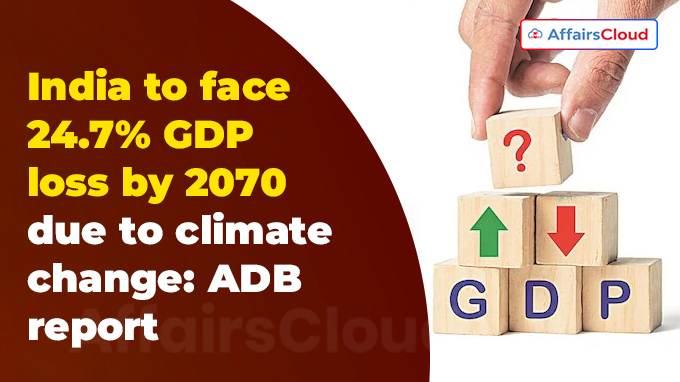 India to face 24.7% GDP loss by 2070 due to climate change ADB reportAccording to the inaugural edition of Asian Development Bank (ADB)’s report titled “Asia-Pacific Climate Report 2024: Catalyzing Finance and Policy Solutions”, climate change under a high-end emissions scenarios could potentially lead to 16.9% loss in Gross Domestic Product (GDP) by 2070 across the Asia-Pacific region, with India projected to witness a 24.7% GDP decline.