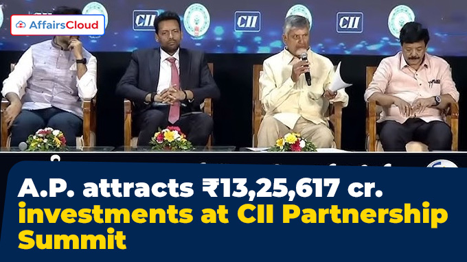 The Government of Andhra Pradesh (AP) secured investments worth Rs.13.25 lakh crore, including 613 Memorandum of Understandings (MoUs) at the Confederation of Indian Industry (CII) Partnership Summit held from 14 to 15 November 2025 in Visakhapatnam, Andhra Pradesh (AP).