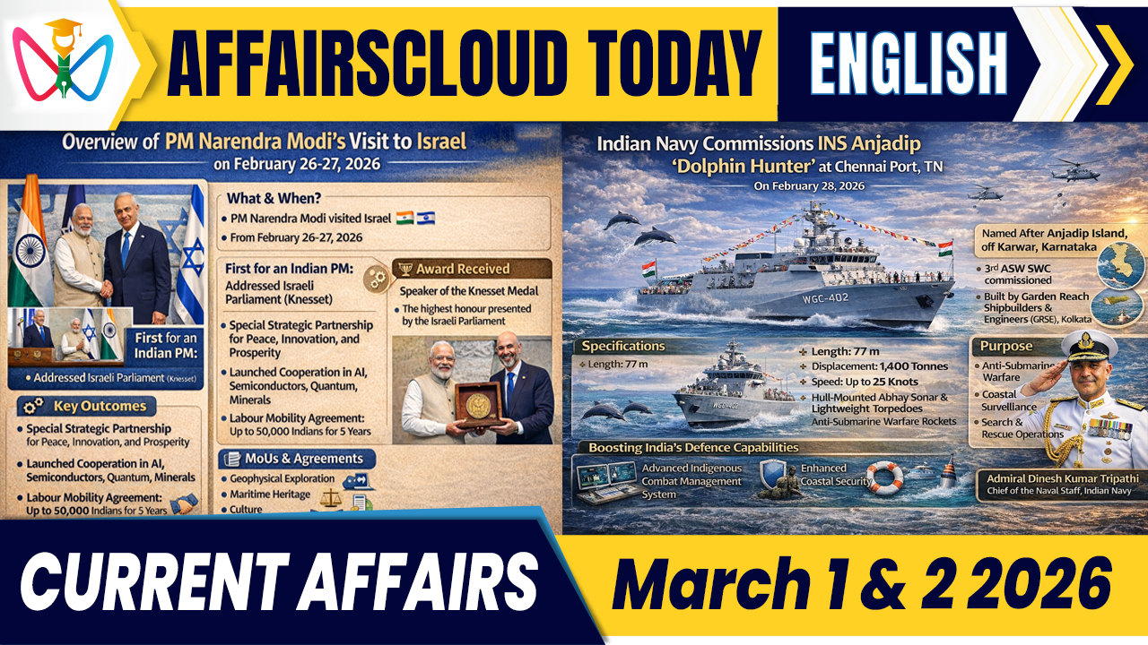 We are here for you to provide the important Recent and Latest Current Affairs March 1 & 2 2026, which have unique updates of Latest Current Affairs 2026 events from all newspapers such as The Hindu, The Economic Times, PIB, Times of India, PTI, Indian Express, Business Standard and all Government official websites.