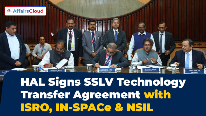 HAL Signed SSLV Technology Transfer Agreement with ISRO, IN-SPACe, and NSILIn September 2025, Hindustan Aeronautics Limited (HAL) signed a Technology Transfer Agreement (TTA) with Indian Space Research Organisation (ISRO), Indian National Space Promotion and Authorisation Centre (IN-SPACe), and NewSpace India Limited (NSIL) for the Small Satellite Launch Vehicle (SSLV), in Bengaluru, Karnataka.