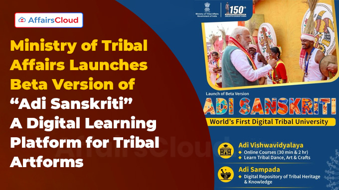 MoTA launches Beta Version of Adi Sankriti, a digital platform for tribal art formsIn September 2025, the Ministry of Tribal Affairs (MoTA), Government of India (GoI) launched the Beta version of “Adi Sanskriti” during the National Conference on Adi Karmayogi Abhiyan held at Bharat Mandapam, New Delhi (Delhi).