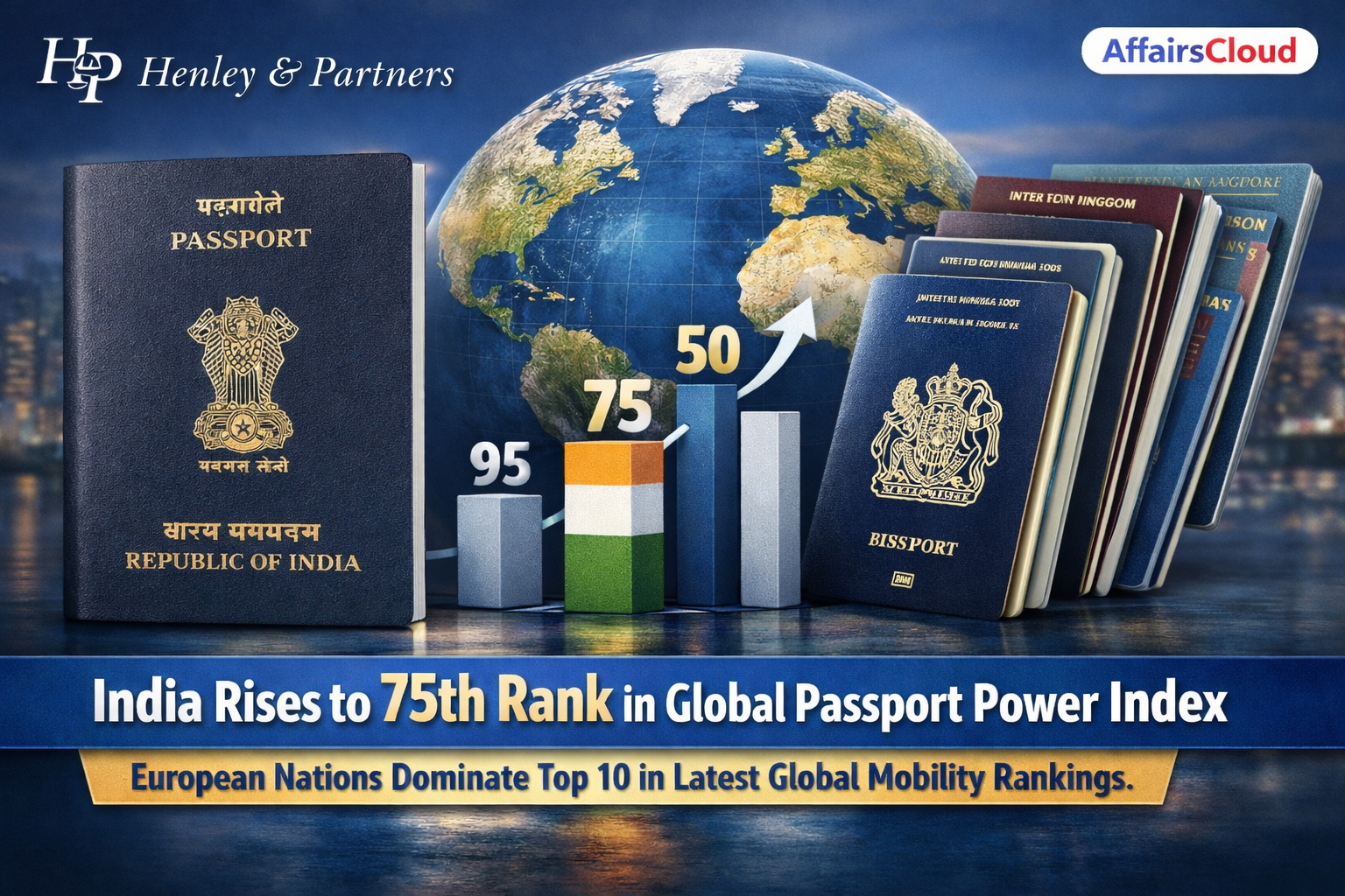 In February 2026, Henley & Partners, a British consultancy expertized in investment migration, released Henley Passport Index (HPI) Global Ranking – February 2026. India’s passport improved its global position to 75th rank, up from 80th in January 2026 and 85th in 2025, reflecting gradual progress in travel freedom.
