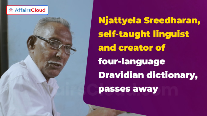 On August 13, 2025, renowned self-taught linguist Njattyela Sreedharan, passed away at the age of 87 in Kannur, Kerala. He was born in 1938 in Thalassery, Kerala.