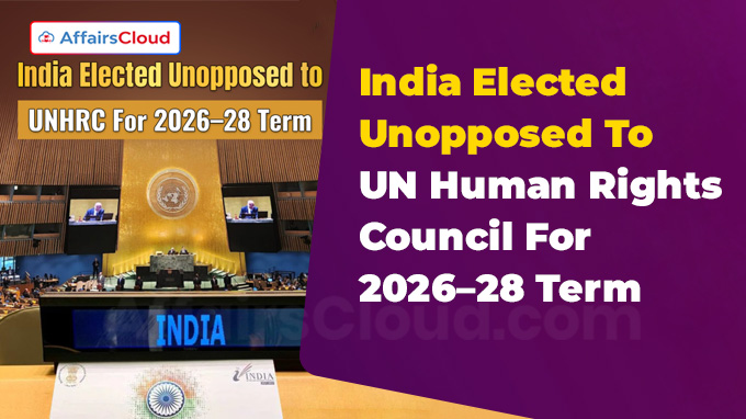 India Elected For 7th time to UNHRC for 2026-28 TermIn October 2025, India was elected unopposed to the United Nations Human Rights Council (UNHRC) with 177 out of 188 votes for the 2026–28 term (January 1, 2026 – December 31, 2028), marking its seventh tenure on the Council.