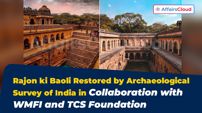 ASI in Collaboration with WMFI & TCS Foundation Restored Rajon ki BaoliIn May 2025, New Delhi (Delhi)-based Archaeological Survey of India (ASI) under the Ministry of Culture (MoC) in collaboration the World Monuments Fund India (WMFI) and Mumbai (Maharashtra)-based Tata Consultancy Services (TCS foundation), has successfully restored a 16th century old step well, ‘Rajon ki Baoli’ located at Mehrauli Archaeological Park, Jamali Kamali in New Delhi (Delhi).