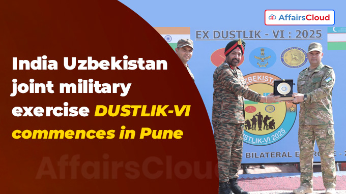 In April 2025, the 6th edition of the India-Uzbekistan Joint Military Exercise(DUSTLIK-VI) commenced at the Foreign Training Node (FTN) in Aundh, Pune (Maharashtra). The 13-day exercise is scheduled to be conducted from April 16- 28, 2025.