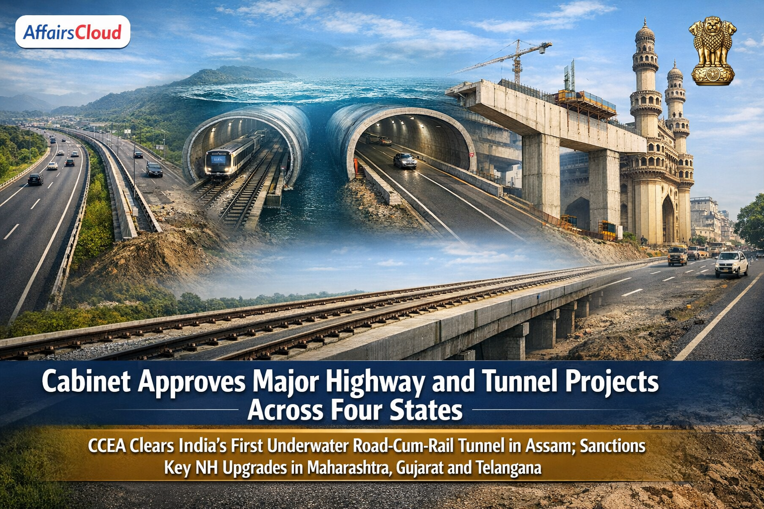 - The CCEA also approved the construction of India’s 1st underwater twin tube road-cum-rail tunnel project with estimated Cost of Rs 18,662 crore under Brahmaputra river in Assam.