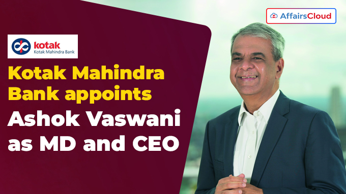 कोटक महिंद्रा बैंक लिमिटेड (KMBL) ने 1 जनवरी, 2024 से 3 साल के लिए अशोक वासवानी को बैंक के निदेशक, प्रबंध निदेशक (MD) & मुख्य कार्यकारी अधिकारी (CEO) और प्रमुख प्रबंधकीय कार्मिक के रूप में नियुक्त किया है।