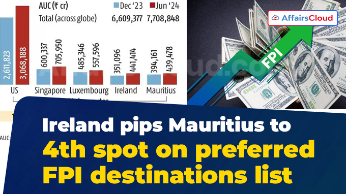 According to the National Securities Depository Limited (NSDL) data, Ireland with Assets Under Custody (AUC) of Rs 4.41 trillion registered on 30th June 2024, has replaced Mauritius to secure 4th spot on preferred Foreign Portfolio Investor (FPI) destination list.