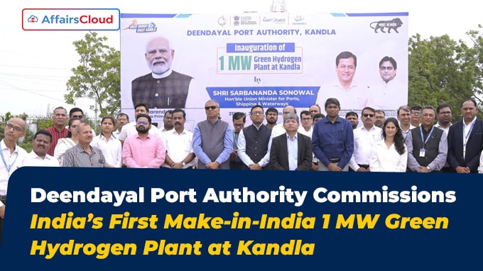 On 31st July 2025, Union Minister Sarbananda Sonowal, Ministry of Ports, Shipping and Waterways (MoPSW), inaugurated India’s first indigenously-built 1 megawatt (MW) Green Hydrogen Power Plant at the Deendayal Port Authority (DPA) in Kandla, Gujarat.