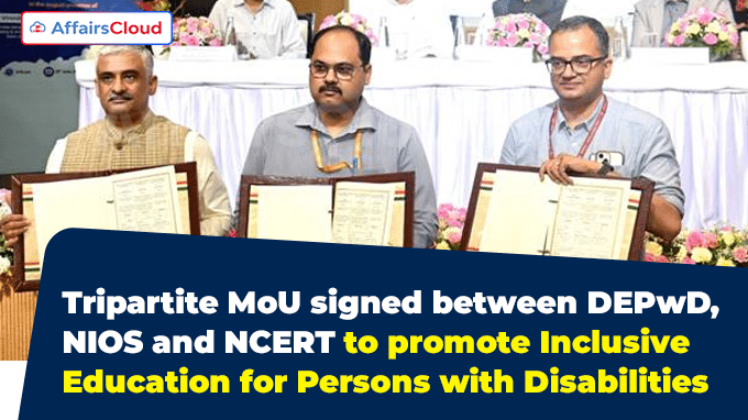 In June 18, 2025, a Tripartite Memorandum of Understanding (MoU) was signed among Department of Empowerment of Persons with Disabilities (DEPwD), Ministry of Social Justice and Empowerment (MSJE); Noida, Uttar Pradesh (UP) based National Institute of Open Schooling (NIOS); and New Delhi, Delhi Based National Council of Educational Research and Training (NCERT) in New Delhi to strengthen inclusive education for Persons with Disabilities (PwD).