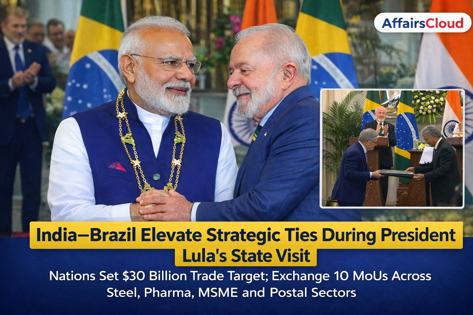 - The India–Brazil Economic Forum held in New Delhi discussed cooperation in defence, renewable energy, pharmaceuticals, agriculture, technology, Artificial Intelligence (AI), and expansion of the India–Mercosur Preferential Trade Agreement (PTA).