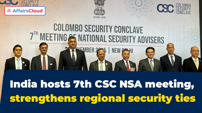On 20 November 2025, India hosted the 7th National Security Adviser (NSA)-level meeting of the Colombo Security Conclave (CSC) in New Delhi, Delhi, chaired by Ajit Doval, NSA of India .