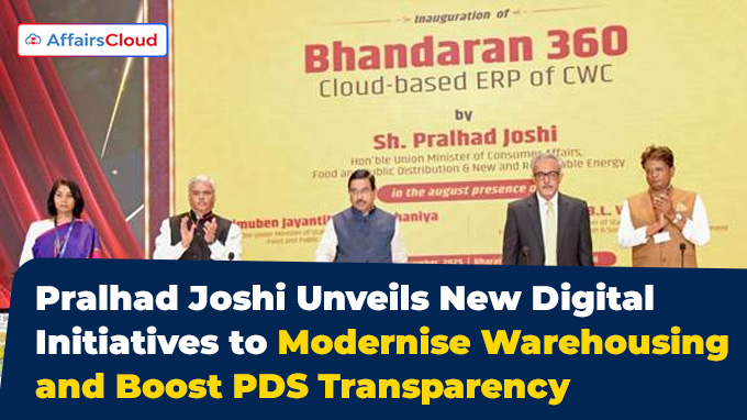 In November 2025, Union Minister Pralhad Joshi, Ministry of Consumer Affairs, Food and Public Distribution (MoCAF&PD), launched a set of new digital platforms aimed at modernizing warehousing operations and improving transparency in the Public Distribution System (PDS).