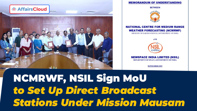 NCMRWF Signs MoU with NSIL to Establish Two DBNet Stations under Mission MausamOn 23 September 2025, the National Centre for Medium Range Weather Forecasting (NCMRWF) under the Ministry of Earth Sciences (MoES), signed a Memorandum of Understanding (MoU) with New Space India Limited (NSIL), the Public Sector Undertaking (PSU) under the Department of Space (DoS), at Prithvi Bhavan, New Delhi(Delhi) to establish two Direct Broadcast Network (DBNet) stations in Delhi and Chennai (Tamil Nadu, TN), under the Mission Mausam project.