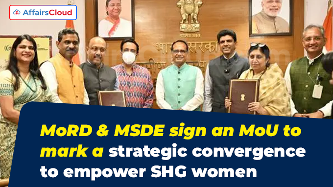 The Ministry of Rural Development (MoRD) and the Ministry of Skill Development and Entrepreneurship (MSDE) signed a Memorandum of Understanding (MoU), to strengthen the Deendayal Antyodaya Yojana – National Rural Livelihoods Mission (DAY-NRLM), at Krishi Bhawan, New Delhi (Delhi).