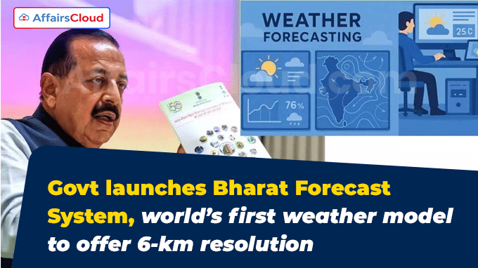 On May 26, 2025, Union Minister Jitendra Singh, Ministry of Earth Sciences (MoES), unveiled the ‘Bharat Forecast System (BFS)’, the world’s first high-resolution Numerical Weather Prediction (NWP) model offering a 6 kilometre (km) spatial resolution, at an event in Vigyan Bhawan in New Delhi, Delhi.
