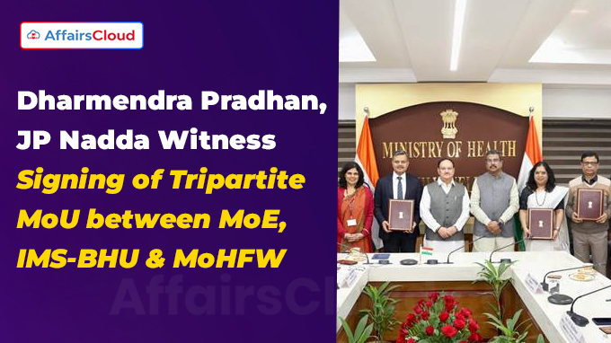 The Ministry of Health and Family Welfare (MoH&FW) signed a tripartite Memorandum of Understanding (MoU) with the Banaras Hindu University (BHU), and Ministry of Education (MoE) to provide enhanced funding and technical support to Institute of Medical Sciences (IMS), institutes of BHU in Varanasi, Uttar Pradesh (UP).