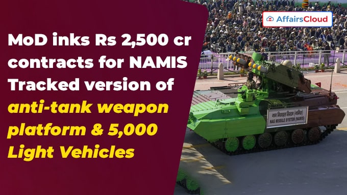 - The MoD signed contract with Chennai (Tamil Nadu)-based Armoured Vehicles Nigam Limited (AVNL) for the Nag Missile System (NAMIS) Tracked Version and with Pune (Maharashtra)-based Force Motors Limited & Mumbai (Maharashtra)-based Mahindra and Mahindra Limited for the supply of light vehicles.
