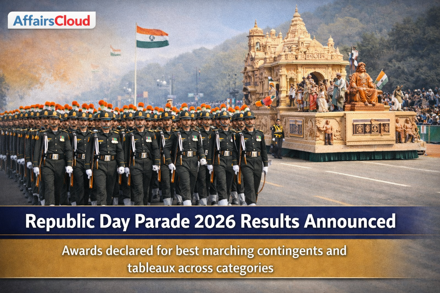 On 28th January 2026, Ministry of Defence (MoD) announced the winners of the Best Marching Contingents and Best Tableaux of the 77th Republic Day Parade 2026, held at Kartavya Path, New Delhi (Delhi), based on a dual evaluation process comprising assessments by three expert judging panels and an online public vote through the MyGov portal for the Popular Choice category.