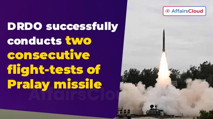 DRDO Conducts Successful Flight Tests of Pralay MissileOn July 28 and 29, 2025, the Defence Research and Development Organisation (DRDO) conducted two consecutive flight tests of the indigenous ‘Pralay’ quasi-ballistic missile during User Evaluation Trials with the Indian Armed Forces from Dr. APJ Abdul Kalam Island, off the coast of Odisha