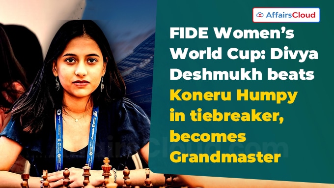 Divya Deshmukh Became 1st Indian to Win FIDE Women’s World Cup 2025, Runner-up KoneruOn July 28, 2025, Divya Deshmukh from Nagpur, Maharashtra, India, won the 2025 FIDE (Fédération Internationale des Échecs) Women’s World Cup, by defeating India’s Koneru Humpy in the finals held in Batumi, Georgia.