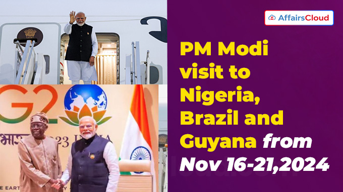 Narendra Modi, Prime Minister (PM) of India, was on a official visit to Nigeria, Brazil, and Guyana from 16th to 21st November 2024 with an aim to strengthen the diplomatic and economic ties with key global partners.