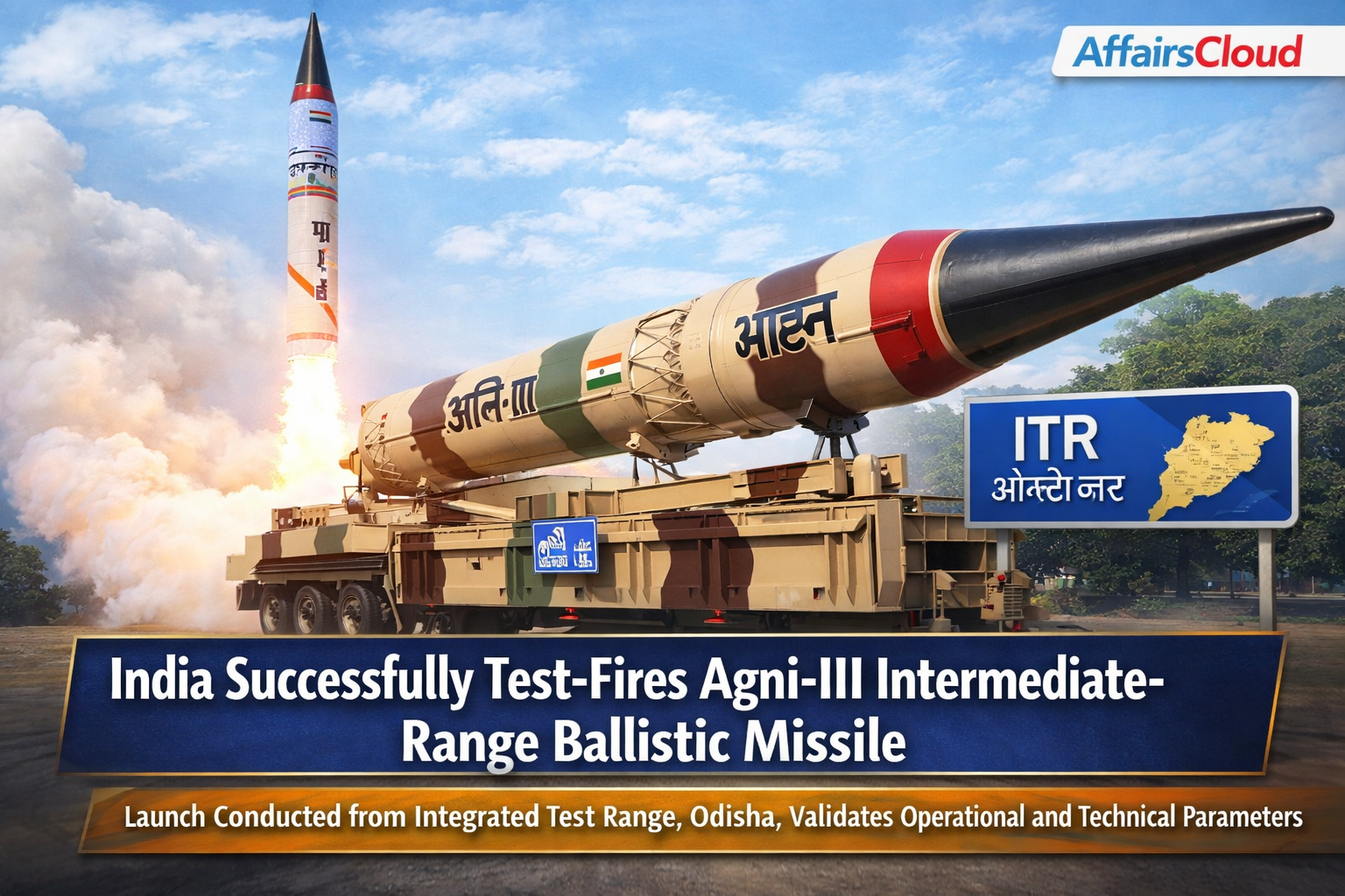 On 6 February 2026, India successfully test-fired the Agni-3 missile, an Intermediate Range Ballistic Missile (IRBM), from the Integrated Test Range (ITR), Chandipur, Odisha.