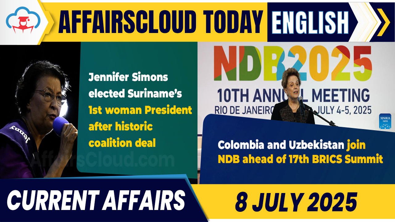 Suriname Elected Jennifer Simons as First Female PresidentOn 6th July 2025, the National Assembly of Suriname elected 71-year-old Dr.Jennifer Geerlings-Simons, a physician and former parliamentary speaker, as the first female President of Suriname, a country on the northeastern coast of South America (SA). Gregory Rusland appointed as vice president of Suriname.