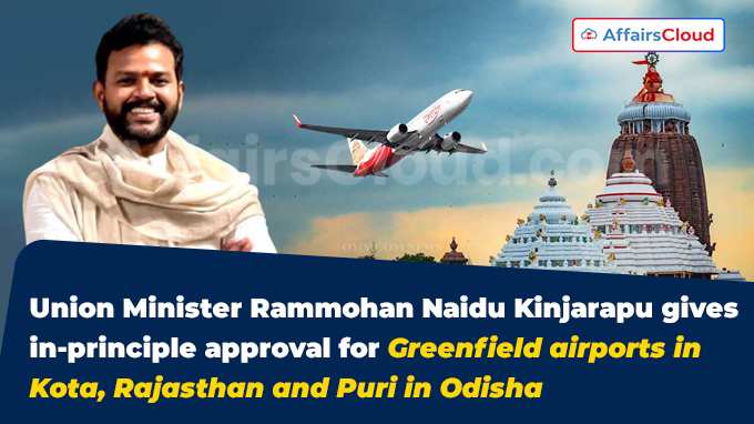 Union Minister Rammohan Naidu Kinjarapu Granted In-Principle Approval for Greenfield Airports in Rajasthan, OdishaIn May 2025, Union Minister KinjarapuRammohan Naidu, Ministry of Civil Aviation (MoCA) has granted in-principle approval for the setting up of greenfield airports in Kota (Rajasthan) and Puri (Odisha).