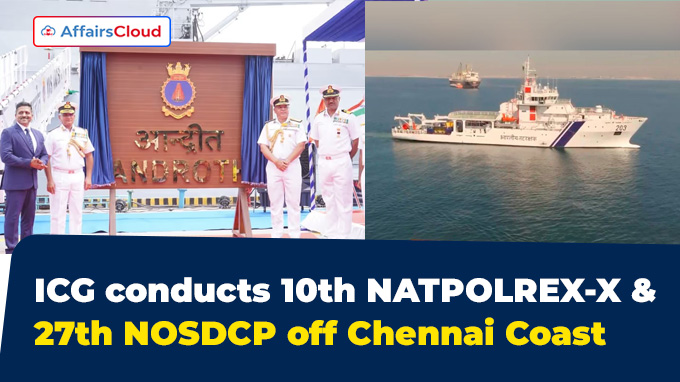 The Indian Coast Guard (ICG) carried out the 10th National Level Pollution Response Exercise (NATPOLREX-X) in conjunction with the 27th National Oil Spill Disaster Contingency Plan (NOSDCP) & Preparedness Meeting from October 5–6, 2025, off the coast of Chennai, Tamil Nadu (TN).