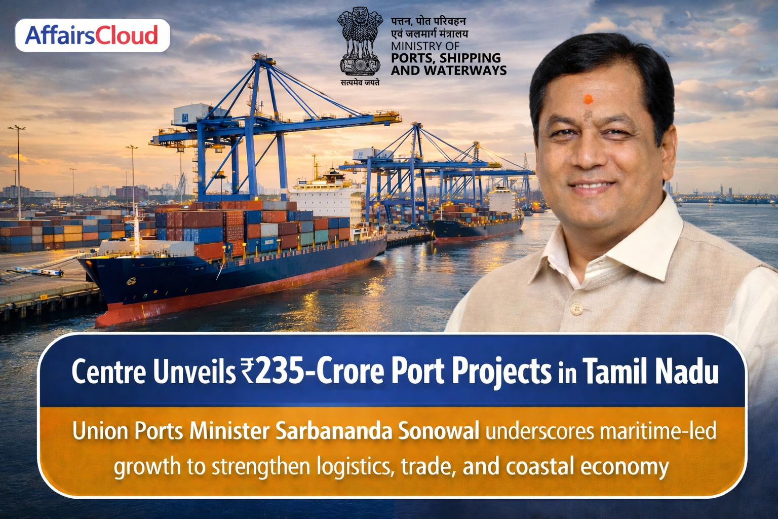 On January 8, 2026, Union Minister Sarbananda Sonowal, Ministry of Ports, Shipping and Waterways (MoPSW), launched port infrastructure and digital governance projects worth Rs.235 crores at Chennai Port Authority (Chennai Port) and Kamarajar Port Limited (KPL) in Chennai (Ennore) (Tamil Nadu, TN), as part of the “Viksit Bharat, Viksit Ports” programme.