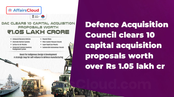 In July 2025, the Defence Acquisition Council (DAC), chaired by Union Minister Rajnath Singh, Ministry of Defence (MoD) approved 10 capital acquisition proposals worth approximately Rs 1.05 lakh crore under the Buy (Indian–Indigenously Designed, Developed and Manufactured, IDDM) category.