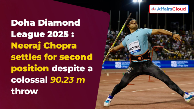 On 16th May 2025, India’s Olympic gold medallist Neeraj Chopra secured second place with a personal best and national record throw of 90.23 metres (m) in the Doha Diamond League 2025 held at the Qatar Sports Club in Doha, Qatar.