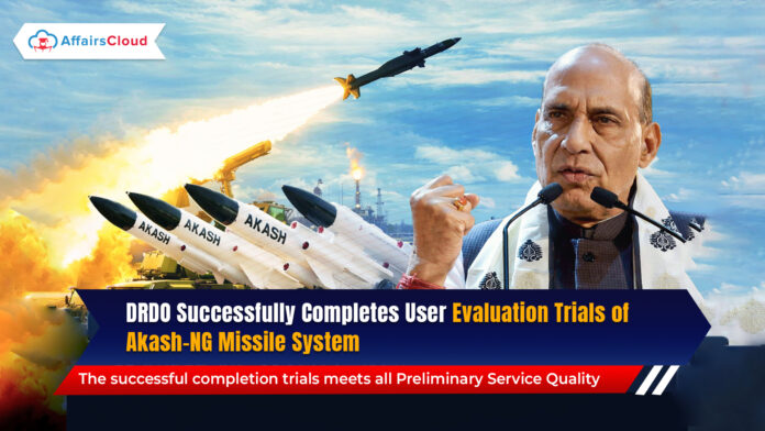 On December 23, 2025, the Defence Research and Development Organization (DRDO), under the Ministry of Defence (MoD), completed the User Evaluation Trials (UETs) of Akash-New Generation (Akash-NG), surface-to-air missile system, at the Integrated Test Range in Chandipur, Odisha.