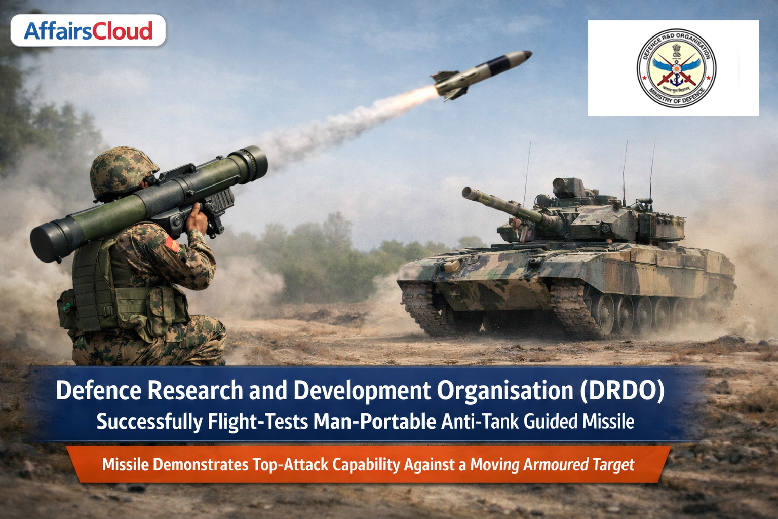 On January 12, 2026, the Defence Research and Development Organization (DRDO), under the Ministry of Defence (MoD), successfully conducted the flight test of the Third-Generation Man-Portable Anti-Tank Guided Missile (MPATGM) with top‑attack capability against a moving target at the KK Ranges in Ahilya Nagar, Maharashtra.
