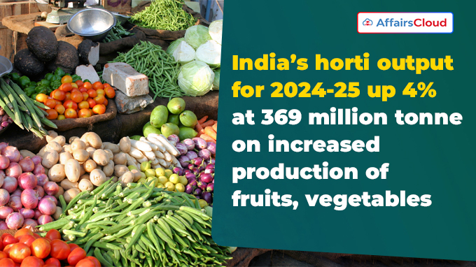 In November 2025, the Ministry of Agriculture and Family Welfare (MoAFW) released the third advance estimates of India’s horticulture production for 2024-25, reporting a 4%(or 14.31 million tonne, MT) increase to 369.05 million tonnes (MT), up from 354.74 MT in 2023‑24.