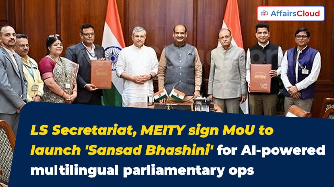 मार्च 2025 में, लोक सभा (LS) सचिवालय ने इलेक्ट्रॉनिक्स और सूचना प्रौद्योगिकी मंत्रालय (MeitY) के साथ एक समझौता ज्ञापन (MoU) पर हस्ताक्षर किए हैं, जिसके तहत ‘संसद भाषिणी‘ नामक एक आर्टिफिशियल इंटेलिजेंस (AI)-संचालित समाधान विकसित किया जाएगा, जो संसदीय संचालन में बहुभाषी समर्थन और सुव्यवस्थित प्रक्रियाओं के लिए व्यापक इन-हाउस AI समाधान प्रदान करेगा।