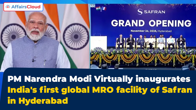 On November 26, 2025, Prime Minister (PM) Narendra Modi virtually inaugurated Safran Aircraft Engine Services India (SAESI) facility, India’s first global aircraft engine Maintenance, Repair, Overhaul (MRO) facility built by France based Safran S.A, at the GMR Aerospace & Industrial Park – Special Economic Zone (SEZ) at Rajiv Gandhi International Airport(RGIA), in Hyderabad, Telangana.