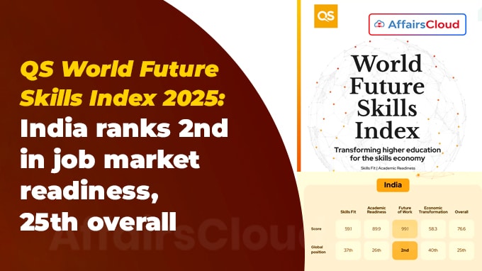 जनवरी 2025 में, लंदन, यूनाइटेड किंगडम, UK स्थित क्वाक्वेरेली साइमंड्स (QS) ने अपना पहला ‘वर्ल्ड फ्यूचर स्किल्स इंडेक्स 2025’ जारी किया। भारत ने 76.6 अंक अर्जित करके वैश्विक स्तर पर 25वां स्थान प्राप्त किया, जो इसे “फ्यूचर स्किल्स कन्टेंडर” के रूप में वर्गीकृत करता है।