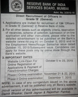 Reserve Bank of India invites a application for recruitment of 134 Officers in Grade-‘B’- (General) – DR.